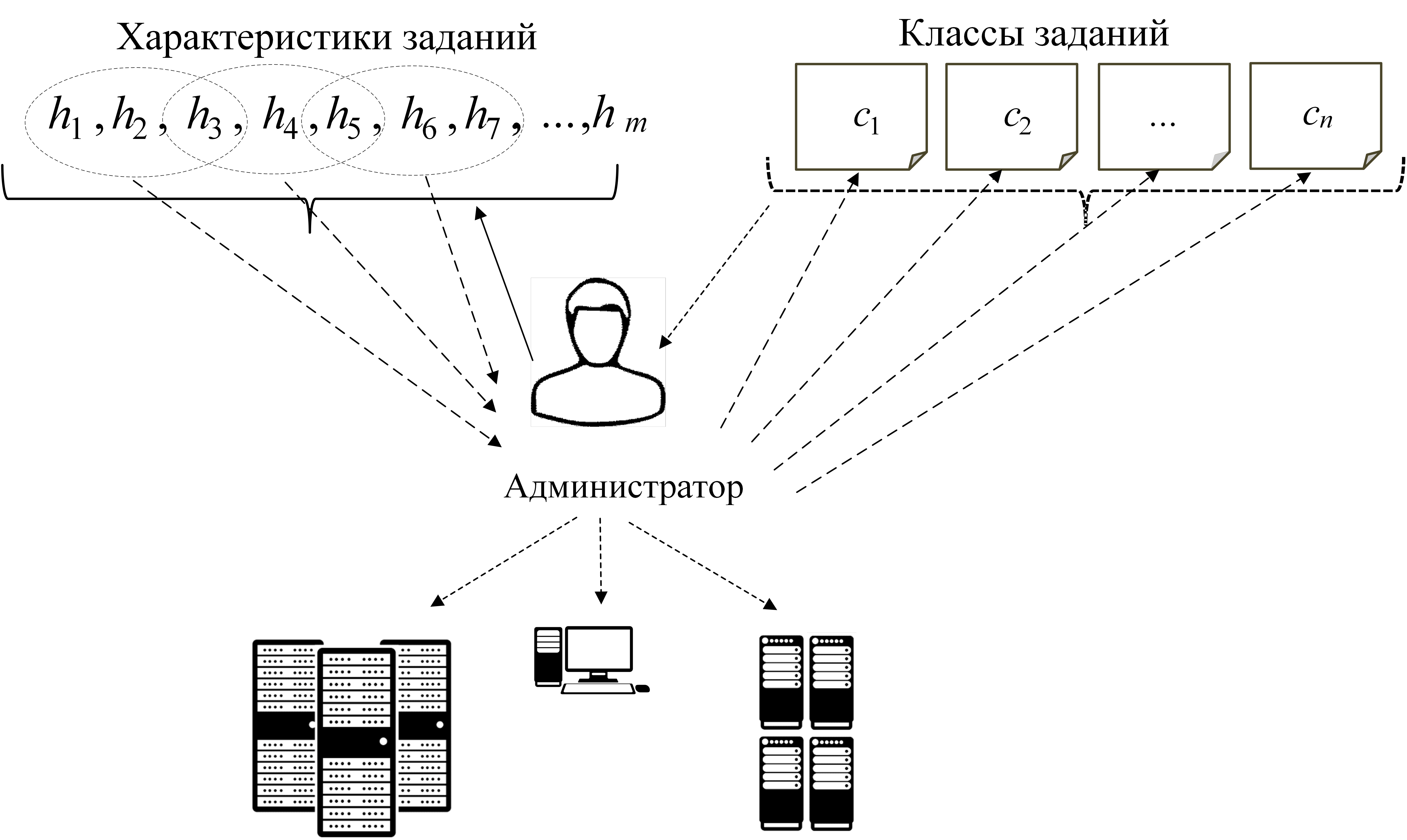 Работа системы классификации заданий базируется на использовании концептуальной модели РВС и является ее дополнением. В этой системе администратор среды определяет множество возможных характеристик $h_1, h_2, …, h_m $ заданий (время решения задачи, размеры оперативной и дисковой памяти, число узлов, процессоров и ядер, режимы выполнения и т.д.), а также области их допустимых значений (рис. 10). Затем он формирует классы $ c_1, c_2, …, c_n $ заданий, обладающих наборами характеристик из определенного множества. Область допустимых значений характеристики при ее включении в тот или иной класс может быть конкретизирована. В заключение сформированным классам сопоставляются наиболее подходящие ресурсы для выполнения заданий, относящихся к этим классам.