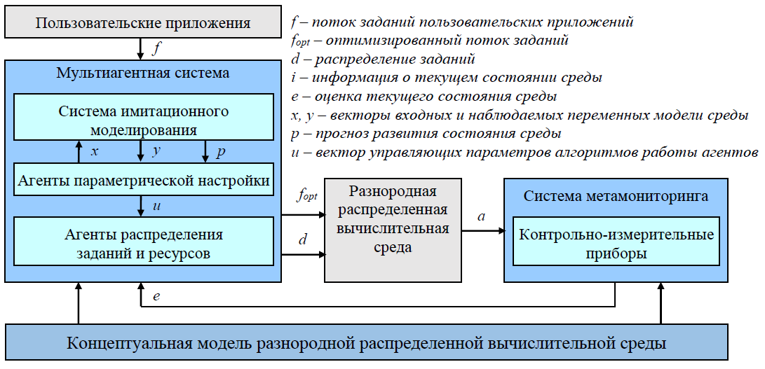 Для поддержки адаптивного обучения агентов разработана новая технология параметрической настройки мультиагентных алгоритмов управления разнородной распределенной вычислительной средой с целью оптимизации распределения ее ресурсов при выполнении заданий приложений пользователей. В отличие от известных подходов в рамках данной технологии управляющие параметры алгоритмов настраиваются на основе интеграции методов и средств классификации заданий и ресурсов среды, а также ее метамониторинга и имитационного моделирования. Комплексное применение перечисленных методов позволяет осуществлять детальный учет характеристик распределяемых ресурсов и выполняемых заданий, оценку текущего состояния среды и прогноз его развития, и тем самым обеспечивает высокую степень эффективности, надежности и масштабируемости вычислений в процессе решения больших задач. Схема параметрической настройки агентов представлена на рис. 12.