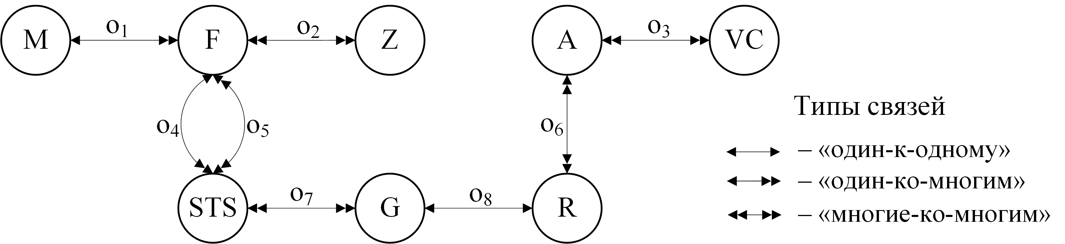 Отношения между объектами обозначены ${{o}_{1}}-{{o}_{8}}$. Отношение ${{o}_{4}}$ представляет взаимосвязь состояний с операциями, реализующими функции переходов. Отношение ${{o}_{5}}$ представляет взаимосвязь состояний с остальными системными операциями. База знаний агента создается на основе вычислительной модели РВС.