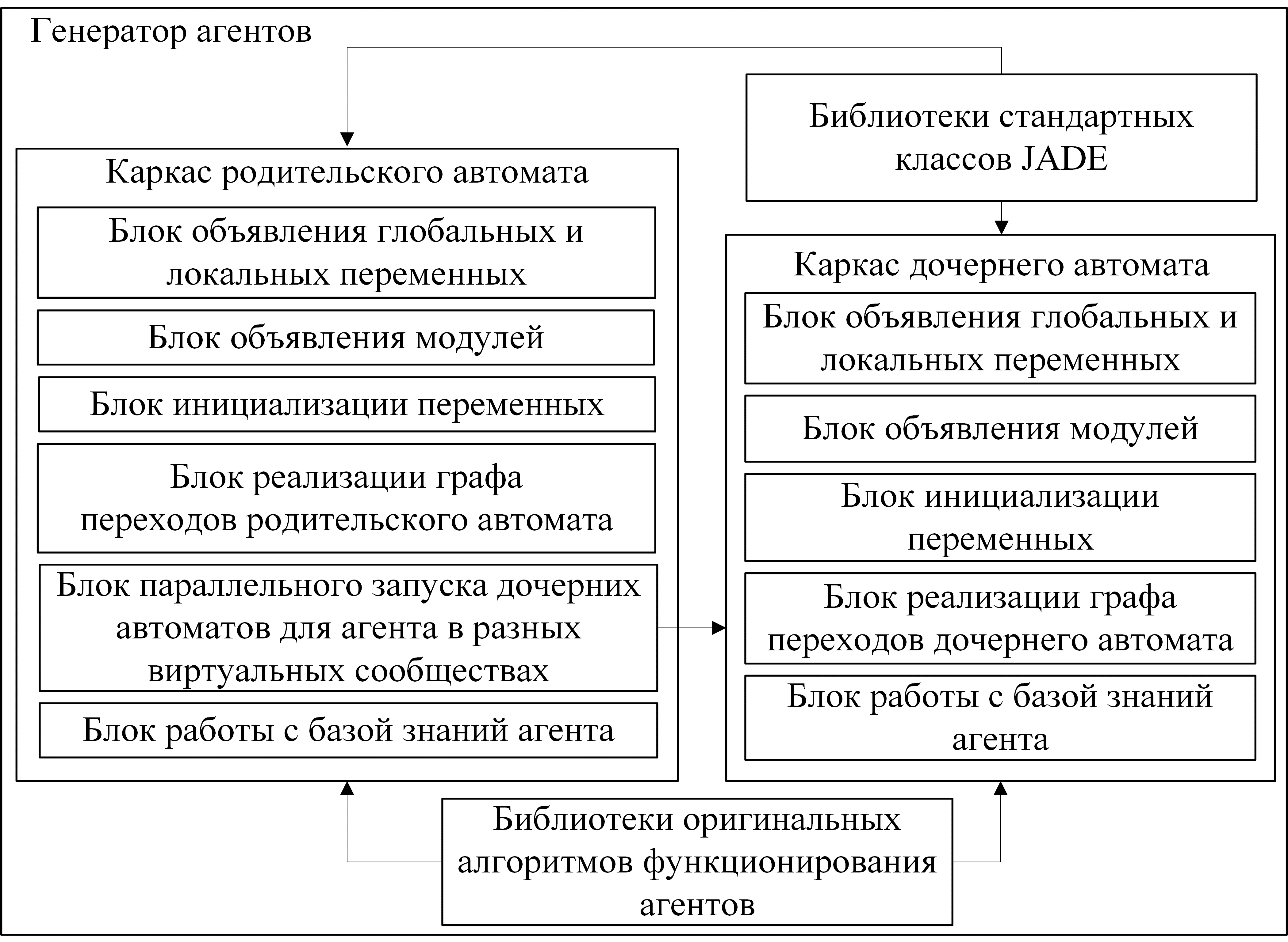 Генерация программного кода агента осуществляется в рамках каркасного подхода к конструированию программ (рис. 7). Для реализации дополнительных методов стандартных классов JADE, представляющих функции (операции) агентов МАС, применяется библиотека «встроенных» алгоритмов функционирования агентов, оформленных в виде модулей.